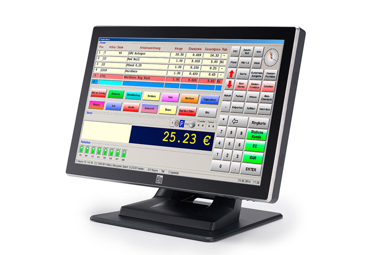 Der Touchscreen spart Platz im Kassenbereich und erleichtert Ihnen die tägliche Arbeit. Da alle Funktionen übersichtlich angezeigt und durch leichte Berührung ausgelöst werden, ist er sehr einfach zu bedienen. Durch seine hochwertige Glasfront ist er außerdem verschleißfrei und leicht zu reinigen.