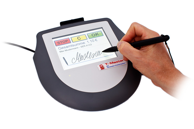 Das T-Master-uPad erfasst Unterschriften von Ihren Kunden in Sekundenschnelle. Durch sein Farbdisplay zeigt es dem Kunden alle relevanten Informationen glasklar an. Die erfassten Unterschriften werden den Datenschutzrichtlinien entsprechend verschlüsselt gespeichert. Bei Ihren Stationskunden werden die Unterschriften übersichtlich am Ende der Abrechnungsperiode der Rechnung angehängt. Sofern Sie eine Unterschrift einmal als Nachweis benötigen, haben Sie direkten Zugriff auf den gesamten Verkaufsvorgang und können diesen inkl. Unterschrift ausdrucken, exportieren oder direkt per E-Mail versenden.